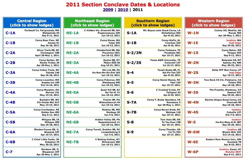 Virginia Arrowmen are surely aware of their upcoming Section SR-7A Conclave April 29-May 1 hosted by Nawakwa Lodge at Camp Brady Saunders, but if you’re wondering when/where the rest of the 300+ OA lodges will be meeting this year, Rob Higgins has created a concise conclave resource at his oasections.com site.