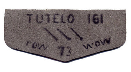 With the first Section SE-1 conclave just a few months away, the new Lodge didn’t have time to order emblems for the event. Brad Roscoe, Tutelo’s first Chief, created leather flaps for the Lodge 161 contingent. The first group he made were on a darker leather. A second batch were on a lighter leather. Reportedly there were six of the first variety and 35 of the second. The contingent also wore handmade blue neckerchiefs with the lettering “TUTELO 161” inside three arrows (the lodge’s new totem).