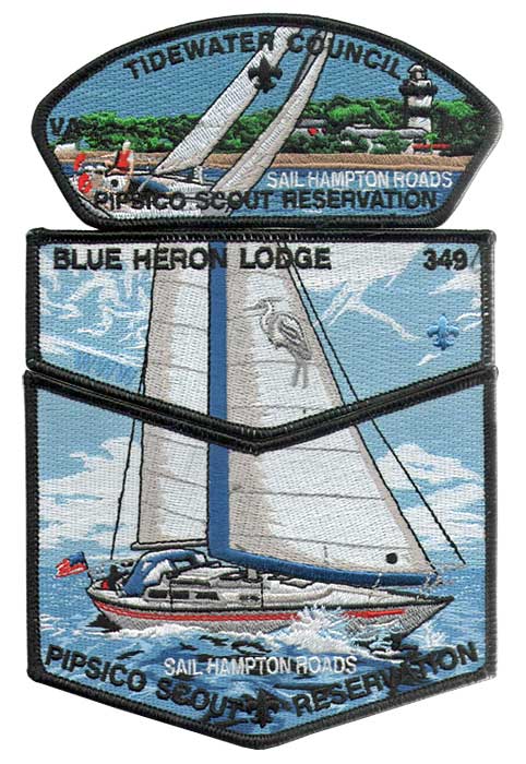 A new 3 piece patch set from Tidewater Council including a Lodge flap from Blue Heron 349 is now on sale in the Trading Post at the Council camp, Pipsico Scout Reservation. The set highlights the Sail Hampton Roads program at the Camp and includes a Tidewater Council shoulder patch and a Blue Heron 349 lodge flap with matching pocket piece.